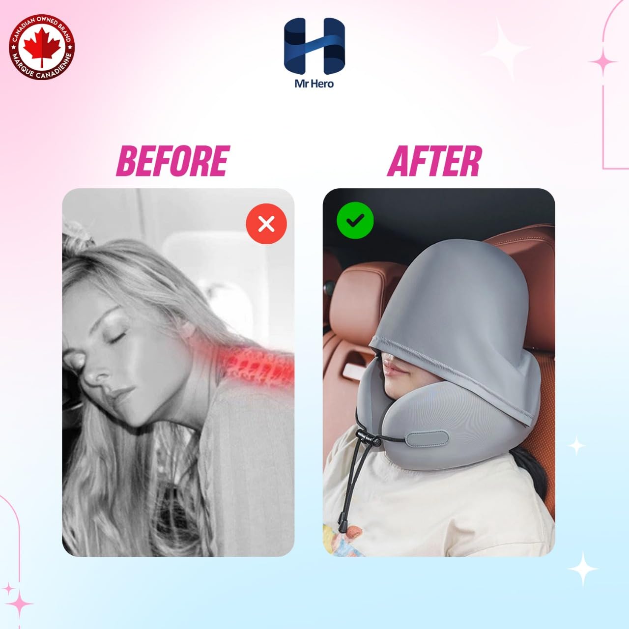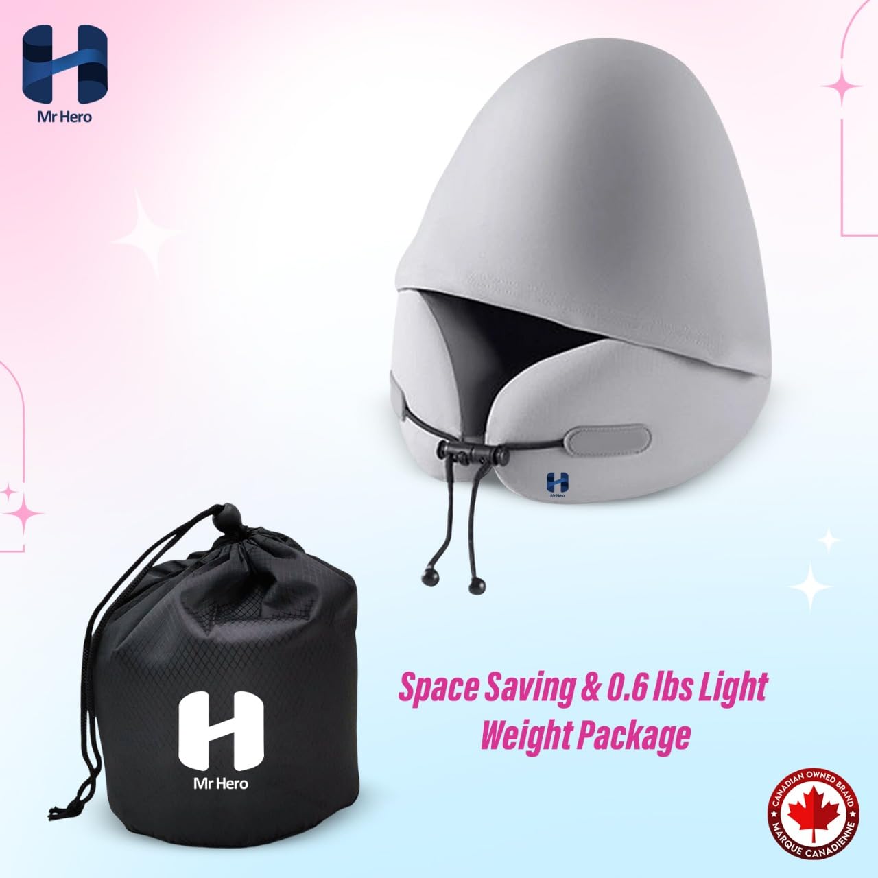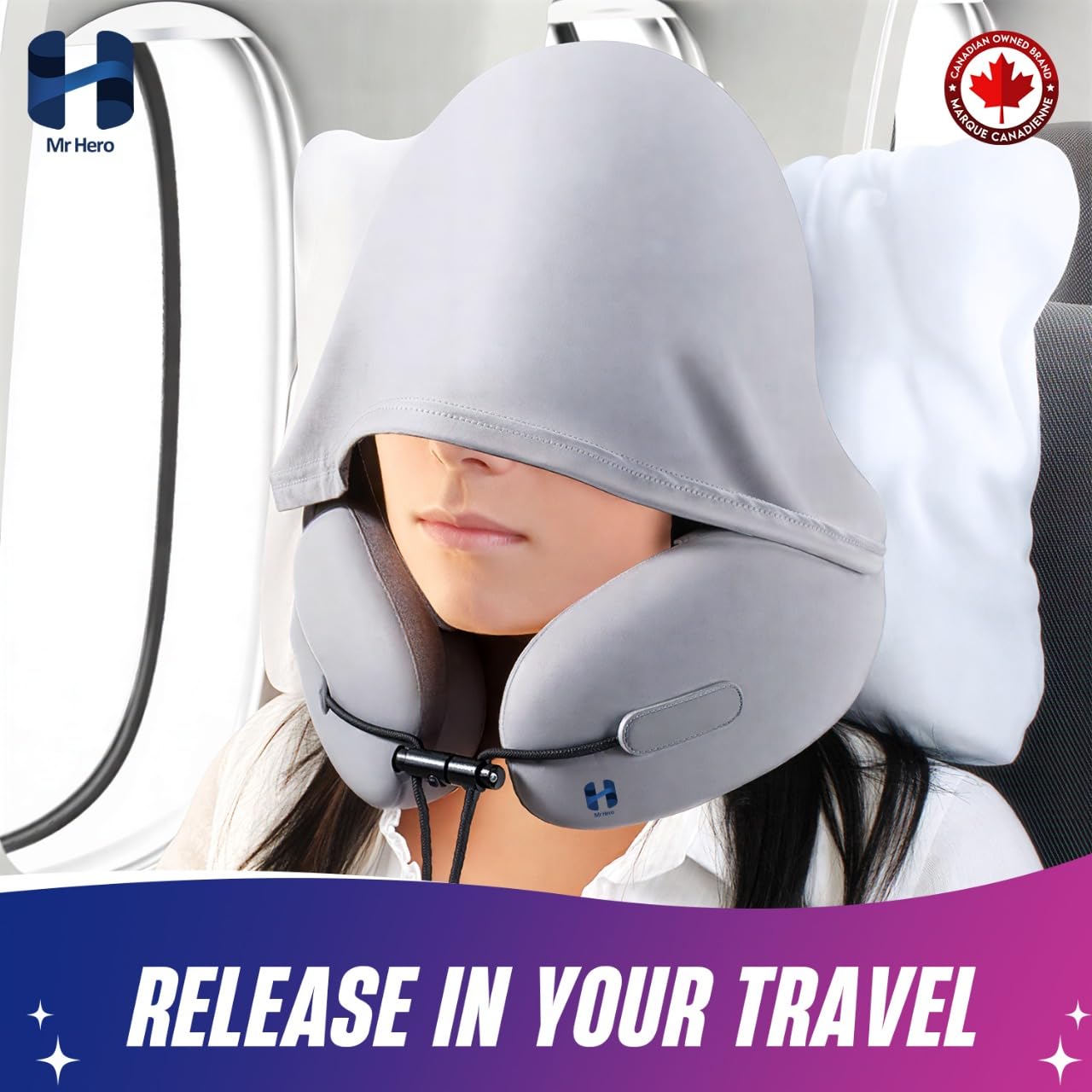 Mr Hero Neck Pillow with Hood ā Travel Pillow with 360° Support & Shading Hoodie, Soft Memory Foam Airplane Pillow for Flight, Car & Office Naps ā Portable Lightweight Design